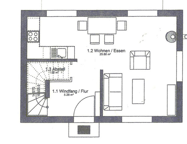 Küche mit Spülmaschine, Backofen, Kühlschrank,