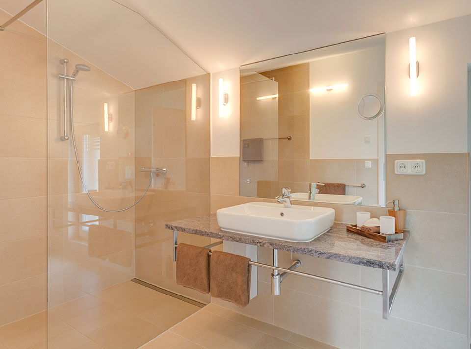 Ein Wohn-/Essraum mit sehr bequemer Eckcouch und Kaminofen bieten Wohlfühlcharakter und die Terasse vor dem Haus umhüllt von einigen Bäumen und einem Garten lädt zum Relaxen ein. Die Schlafräume im Obergeschoss sind sehr liebevoll eingerichtet und bieten viel Ruhe. Die Häuser sind großzügig gestaltet und bieten reichlich Platz für Erholung. Für Fernsehfreudige gibt es sowohl unten als auch oben einen Flatscreen. Die Ferienhäuser verfügen über Fußbodenheizung und kostenloses W-LAN.
